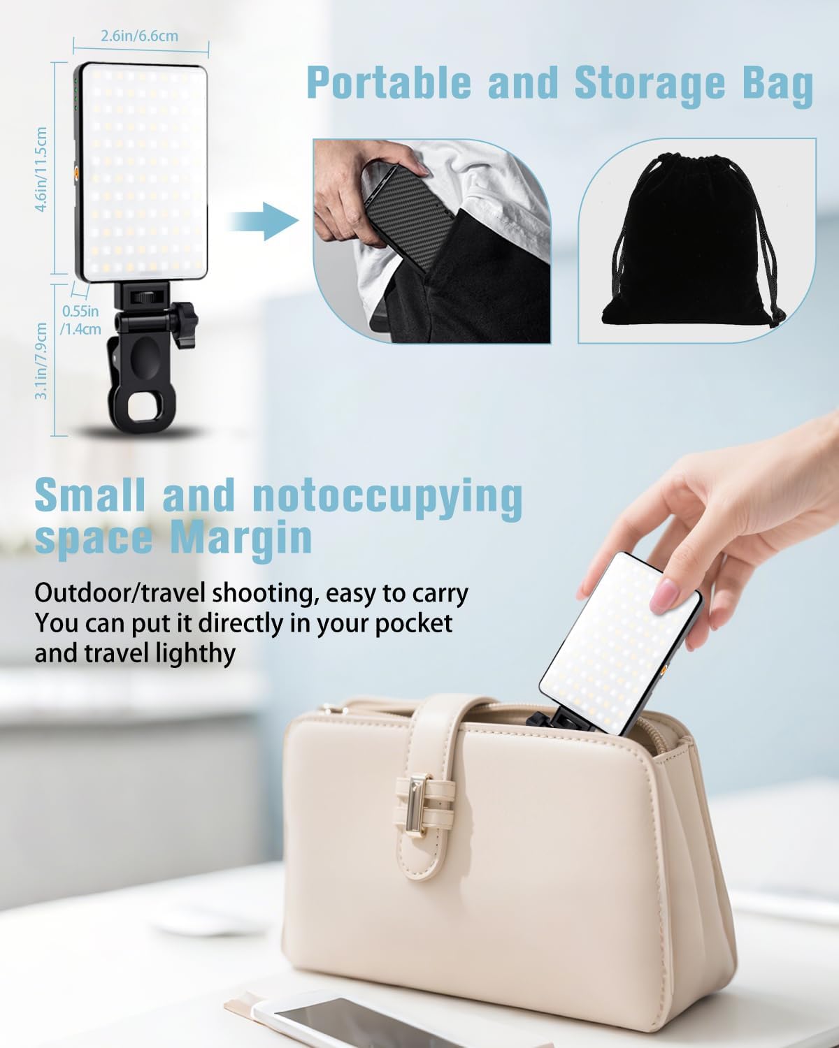 【Compact & Portable】The portable phone light clamp measures 4.5″x 2.6″x 0.6″, Thinner than your phone (14mm) and lighter than an apple (130g). Slides into pockets for spontaneous coffee-shop shoots or cross-country flights . We also provide a portable storage bag for easy carrying while on the go