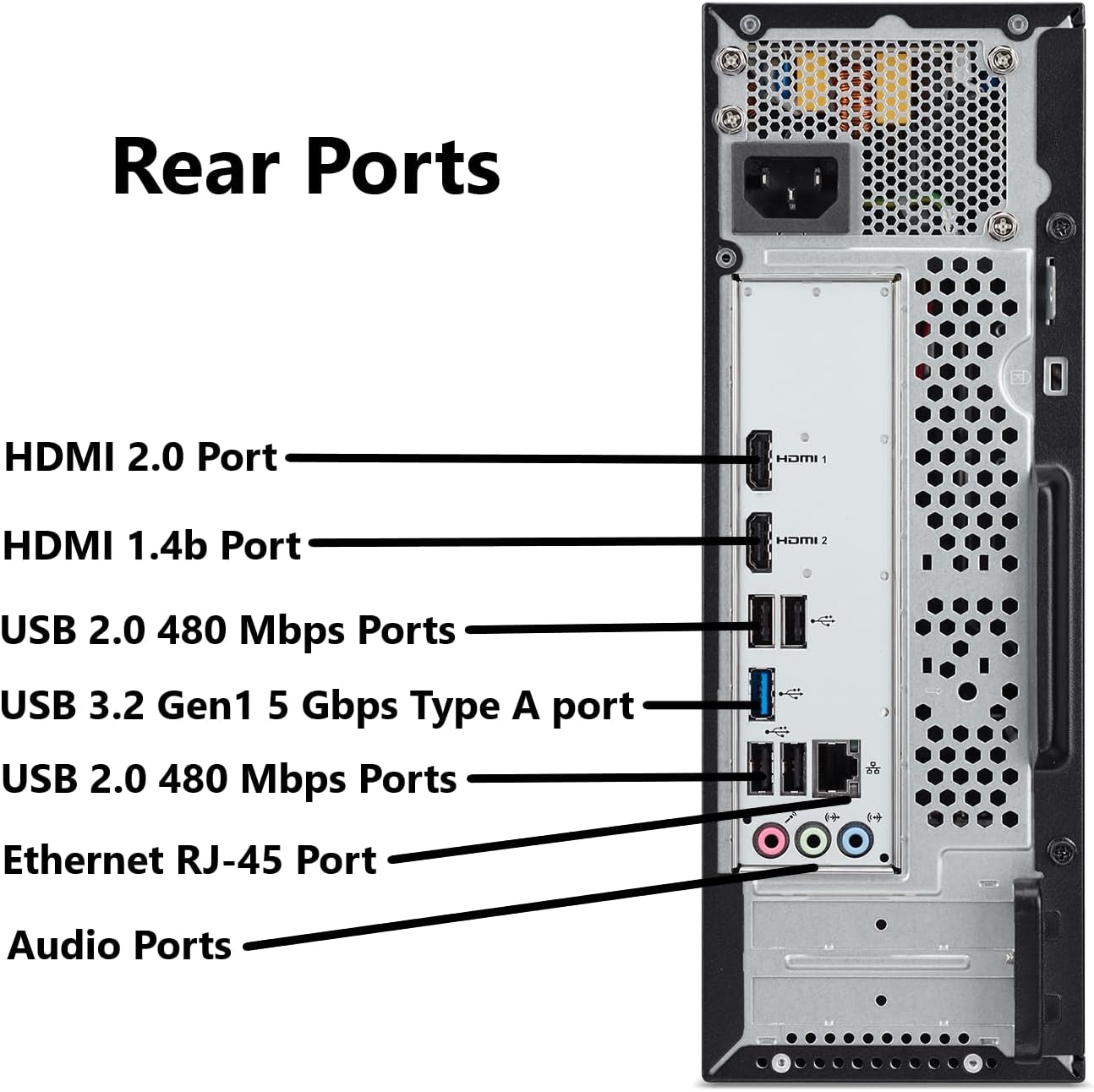 1 – USB 3.2 Gen1 5 Gbps, Type-C Port (Front) | 2 – USB 3.2 Gen1 5Gbps Type-A Ports (1 Front and 1 Rear) | 4 – USB 2.0 480Mbps Ports (Rear) | 1 – HDMI 1.4b Port and 1 – HDMI Out 2.0 Port (Rear) | 1 – Ethernet RJ-45 Port (Rear) | USB Keyboard and Mouse Included