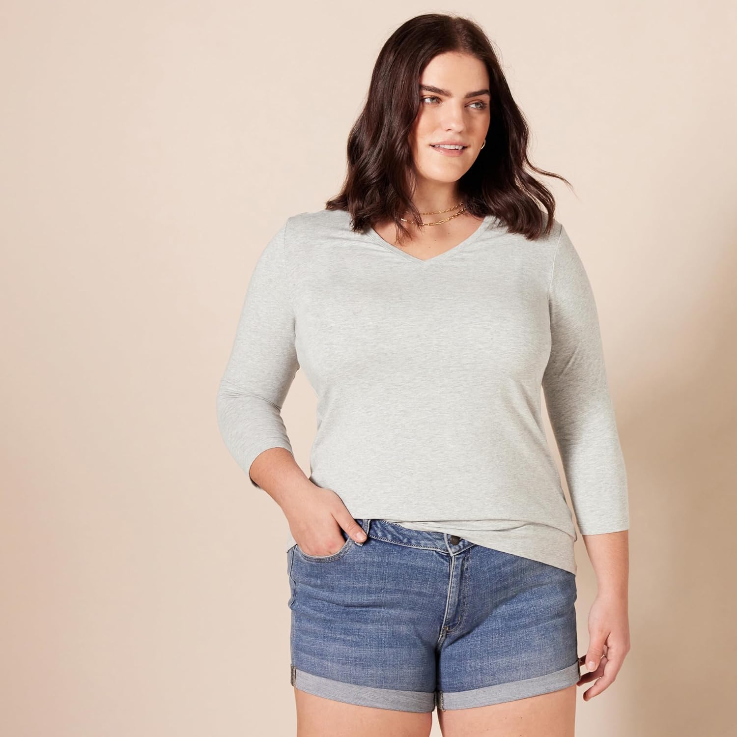 I had already purchased the short sleeve vneck in charcoal and black, as well as the long sleeve in burgundy. So, when I saw the 3/4 length in lt grey and charcoal I knew I needed them. The quality is great, light but not flimsy. They stand up to an industrial washer/dryer and maintain the color and shape. Do not hesitate to to buy multiples of the Amazon Essentials tees. These timeless basics are what you will reach for over and over again.
