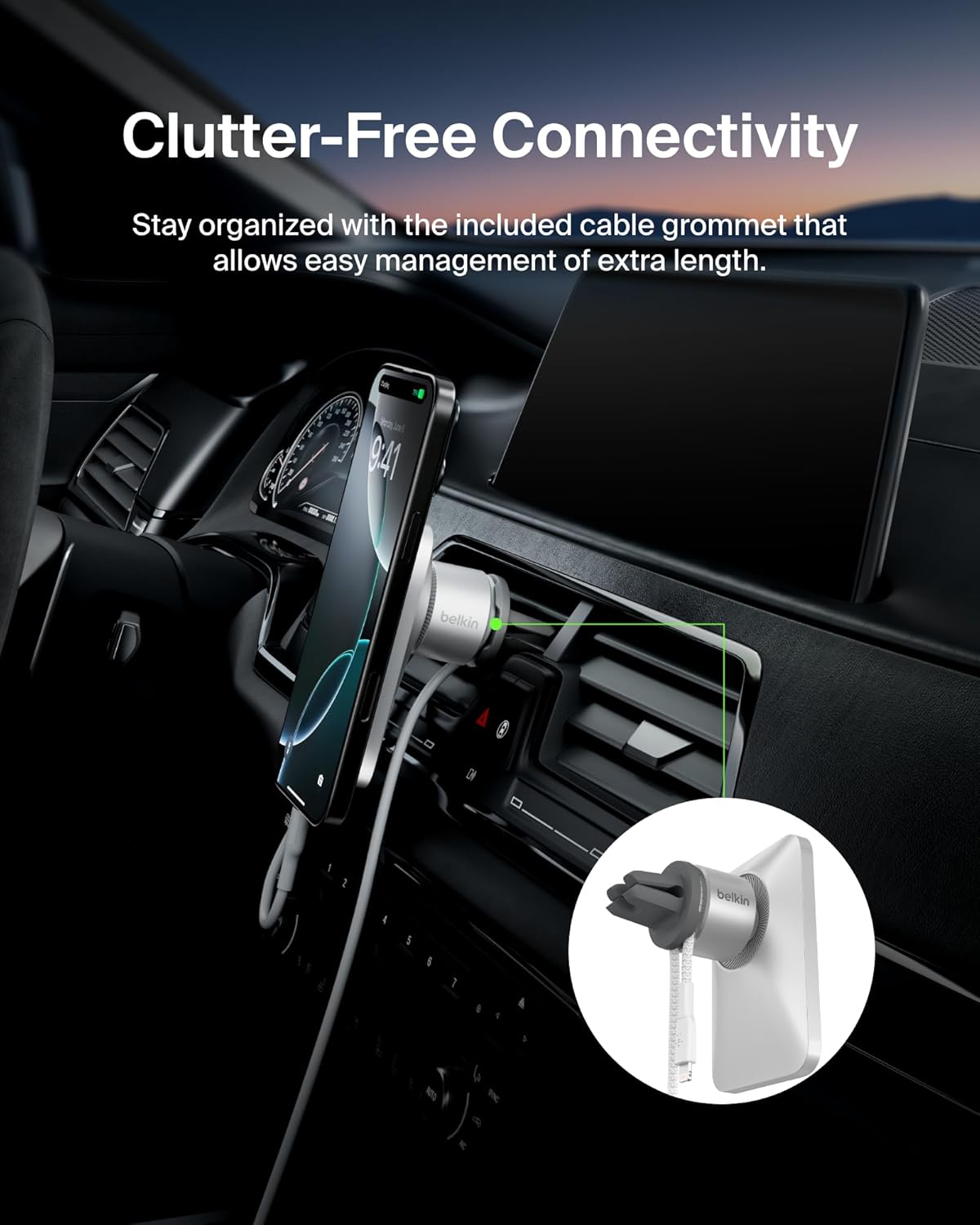 Up your commute game with our Car Vent Mount Pro featuring official MagSafe technology. This portable car phone holder mount is built with the power of MagSafe to securely hold your iPhone 12 and later. Like all Belkin MagSafe accessories, this car phone holder is thoughtfully designed and built to last. The Belkin Vent Mount Pro uses MagSafe technology to ensure an easy and accurate magnetic alignment, so your iPhone stays safely mounted through all the road’s bumps and turns. A high-quality base and sturdy vent clip ensure that your Car Vent Mount Pro with MagSafe stays safely in place. Our MagSafe Car Vent Mount rotates using a high-quality ball joint, so it’s easy to flip from portrait to orientation with one hand. With the integrated cable management system your playlist, directions, and calls won’t be interrupted, and keeps your charging cable neatly organized and within reach. The Car Vent Mount Pro with MagSafe works with official MagSafe cases, just set your iPhone 17, 16, 15, 14, 13, 12 series device, case and all, against the magnetic surface and go. (Car charger cable, and power supply not included).