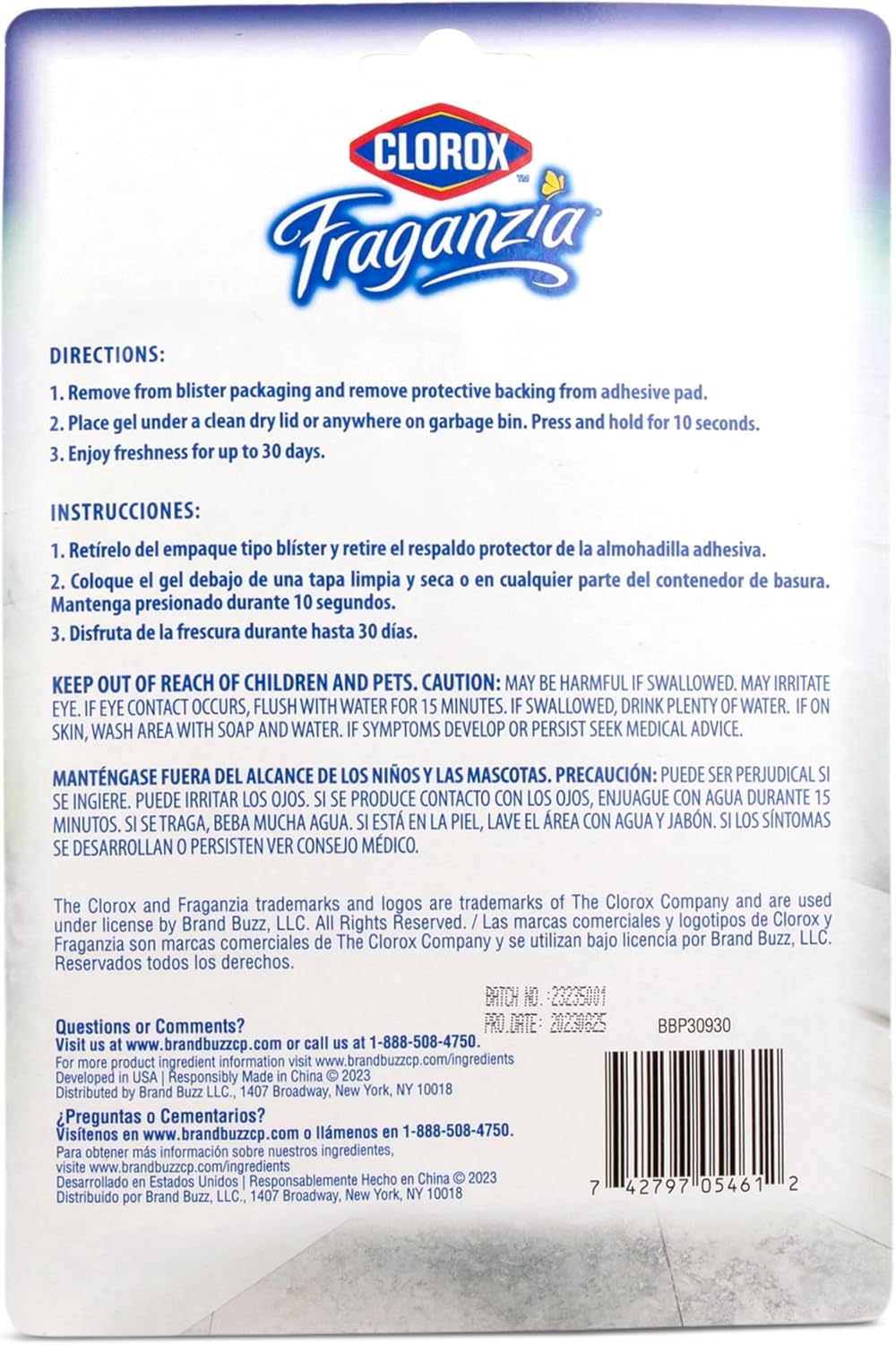 The unique and inviting Clorox Fraganzia scents are here to enhance every area in your home or office, including the smallest spaces like trash cans, recycling bins, lockers, and more These nature-inspired scents, such as Lavender with Eucalyptus and Island Escape, exude freshness wherever you choose to use them Clorox Fraganzia Adhesive Air Freshener Gel will freshen your smallest spaces with a fragrance that lasts It isn’t unusual for recurring, unwanted smells to make their way into locker air fresheners, trash cans, hampers, locker deodorizers, cabinet deodorizer, and drawers These compact, lightweight adhesives can be placed inside the lids of cans and bins, and don’t require any air freshener no plug or day-to-day maintenance The calming Lavender with Eucalyptus air freshener scent is pleasant but not overpowering Simply peel and stick wherever you desire fresh, long-lasting scent Our scent-sational scents have lasting effects that can brighten up any area of the home Each package includes 6 deodorizing units These air freshener gels will continuously release fragrance for up to 30 days of freshness, making them perfect as a kitchen air freshener, locker air freshener deodorizer, or hamper deodorizer Directions: Remove from blister packaging and remove protective backing from adhesive pad Place gel under a clean dry lid or anywhere on the garbage bin Press and hold for 10 seconds Enjoy freshness for up to 30 days *Caution: Keep out of reach of children and pets May be harmful if swallowed May irritate eyes If eye contact occurs, flush with water for 15 minutes If irritation persists, contact a physician Do not mix with other chemicals