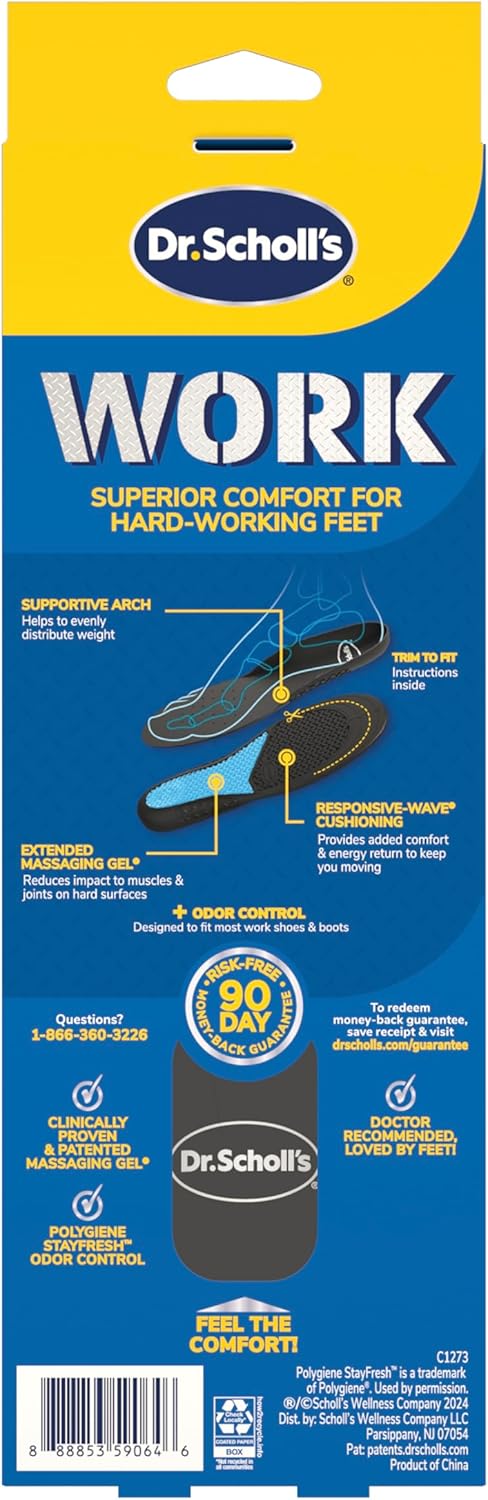 I’ve spent years experimenting with insoles, from cheap foam inserts to high-end orthotics, and nothing compares to the Dr. Scholl’s Work All-Day Superior Comfort Insoles. From the first step, I noticed how the massaging gel cushions both the heel and arch without feeling squishy or unstable. Unlike many insoles that flatten after a few hours, these maintain their shape, giving consistent support from the first step of my day to the last.What really sets these apart is the combination of comfort and performance. The gel not only absorbs shock but also promotes a subtle, almost spa-like “massage” effect as you walk, which makes long shifts on hard floors surprisingly pleasant. My feet no longer feel fatigued or achy after 8–10 hours on concrete or tile, which is a game-changer.I also love the thoughtful engineering: the insoles evenly distribute pressure across the foot, which helps reduce strain on my heels and arches. Unlike other reviews that casually say “comfortable,” I want to highlight that these insoles transform your daily experience. They make long hours on your feet manageable, even enjoyable, especially at jobs where you’re on your feet all day!Durability is another huge plus. I’ve worn them in multiple shoes, work boots, sneakers, and casual shoes, and they maintain both comfort and structure. For anyone tired of ending the day with sore, tired feet, these insoles are a true investment in your comfort and health.If you want your feet to feel supported, energized, and cared for from morning to night, these are hands-down the best insoles I’ve ever used.