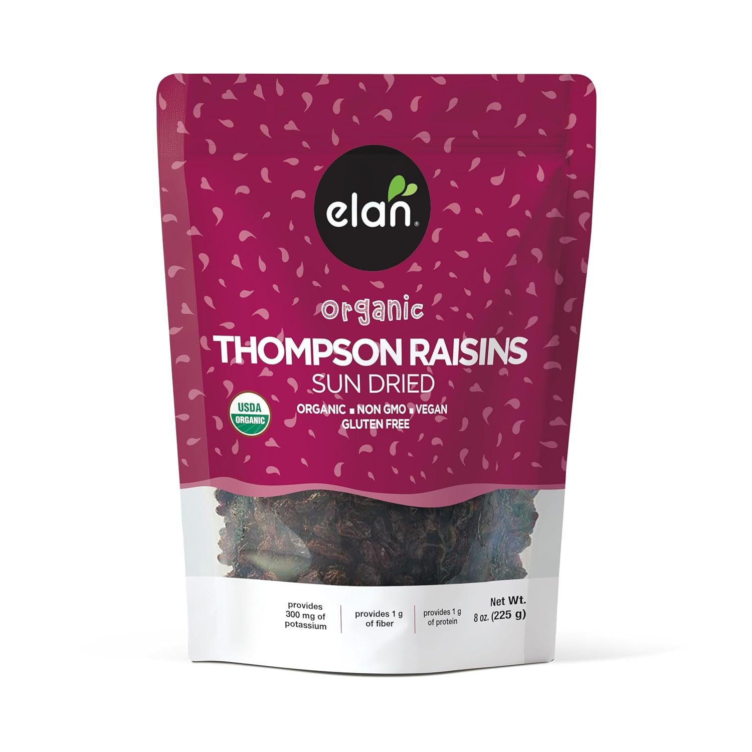 Elan Organic Sun-Dried Thompson Raisins, 7.9 oz, Dried Fruits, No Added Sugar, Non-GMO, Vegan, Gluten-Free, Kosher, Healthy Snacks, Naturally Sweet Snack
