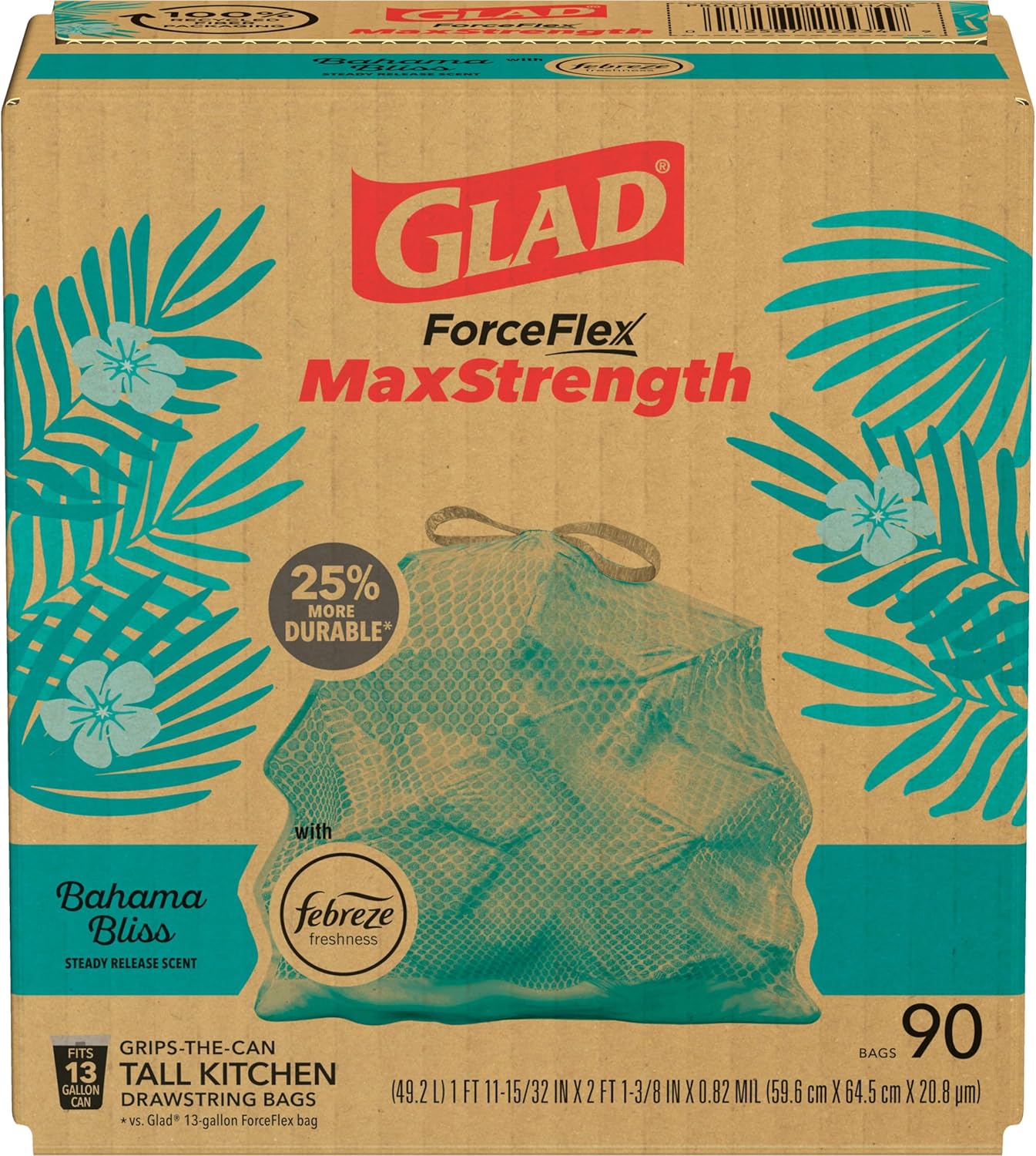 Glad ForceFlex MaxStrength Kitchen Trash Bags, 13 Gal, Bahama Bliss Febreze, 90 Ct (Pack May Vary)