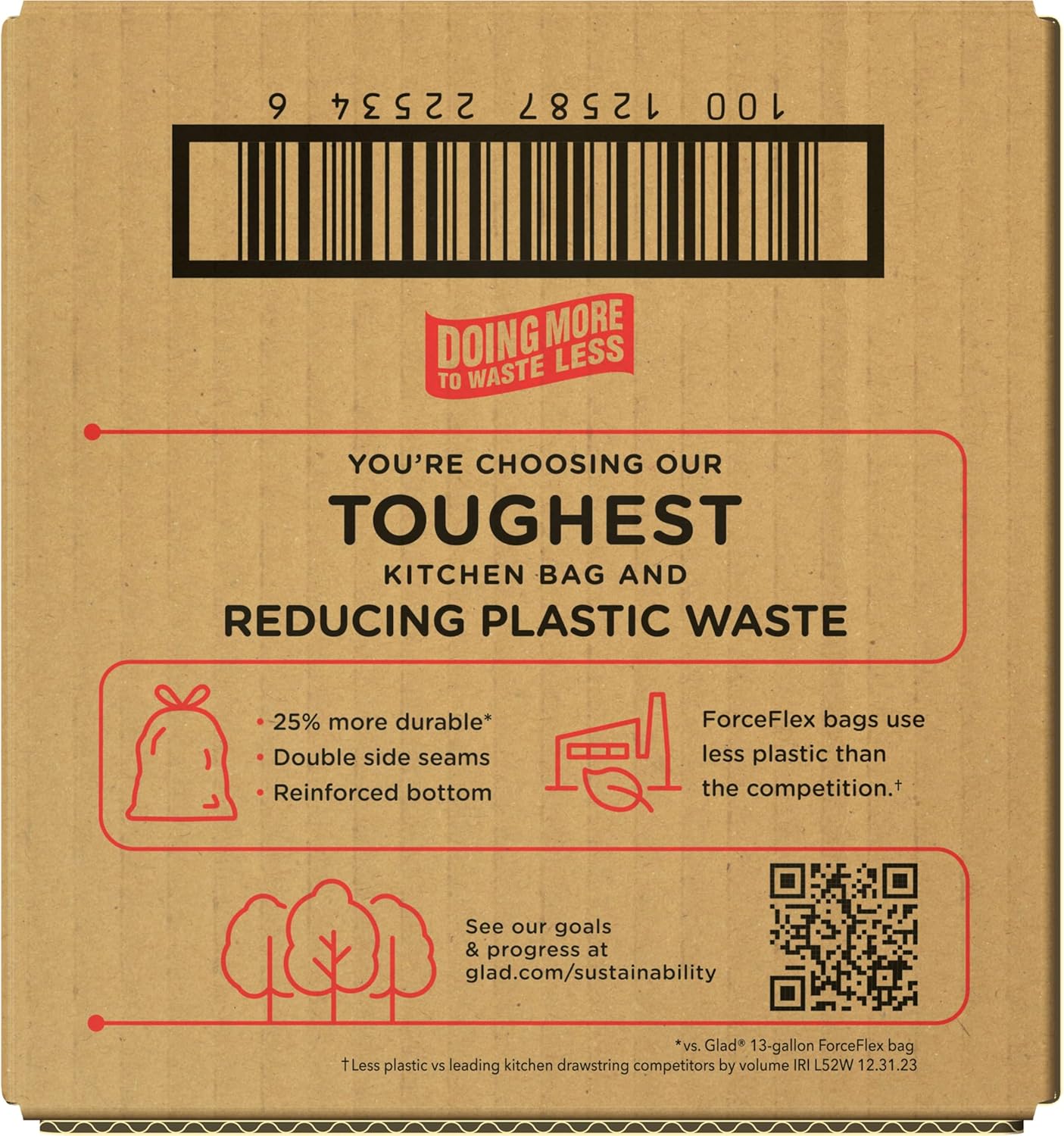 25% MORE DURABLE*: Glad ForceFlex MaxStrength Tall Kitchen Trash Bags are 25% more durable versus Glad 13 gallon ForceFlex Tall Kitchen Trash Bags
