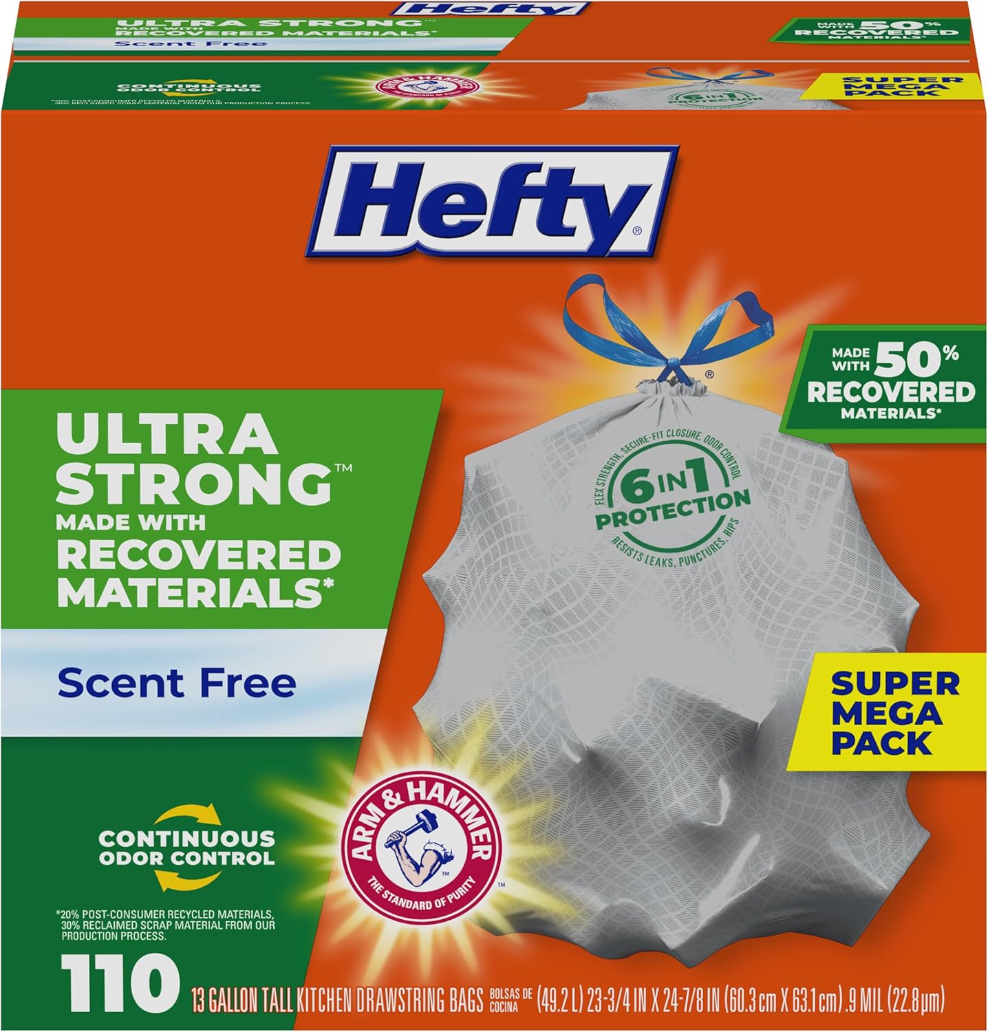 Walk the talk when it comes to reduce, reuse, recycle without sacrificing the strength you need to handle life’s messes. These garbage bags offer signature durability while being made with 50% recovered materials. They feature Hefty 6-in-1 protection, offering flexible strength, a secure-fit closure, odor control, and resistance to punctures, leaks, and tears. The 13 gallon size fits most indoor cans for everyday recycling loads in kitchens, larger office cans or basements. A break-resistant grip drawstring makes it easy to close the bag and take it to the curb without incident. As a bonus, these unscented trash bags include a ARM & HAMMER odor control technologyto keep unpleasant smells at bay. Don’t forget! All Hefty products come with a 100% satisfaction guarantee. *Made with 20% post-consumer recycled materials & 30% reclaimed scrap material from our manufacturing process. **The ARM & HAMMER trademark is owned by Church & Dwight Co., Inc., and used by Reynolds Consumer Products LLC under license.