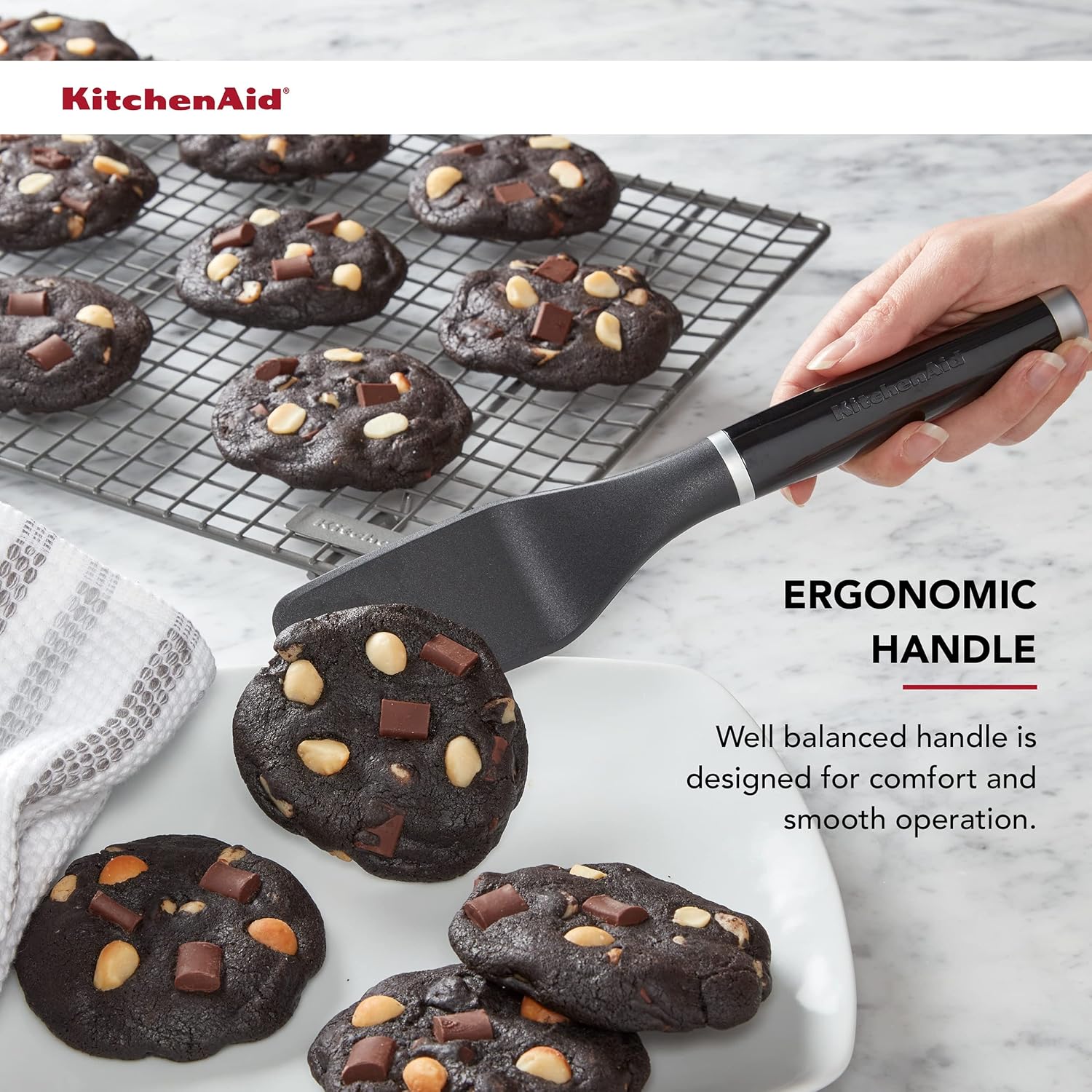 This KitchenAid Cookie Lifter features a flat head that effortlessly slides under cookies or brownies for easy lifting. This durable tool is made from sturdy, heat-resistant nylon, and safe to use on all cookware, including nonstick. It features a well-balanced handle designed for comfort and smooth operation. Dishwasher safe. Lifetime Limited Warranty