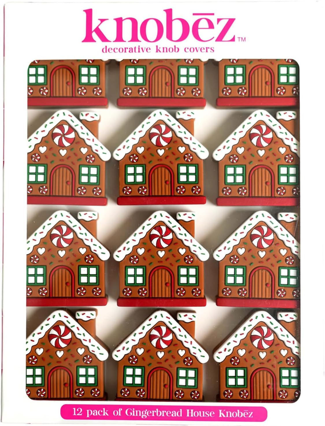 GINGERBREAD HOUSE KNOBEZ (12 PACK): Turn your space into a holiday wonderland with the Gingerbread House Knobēz (12 Pack)—this patented, decorative knob cover stretches over your existing hardware in a matter of seconds. Designed for both form and function, Knobēz provide a fun, clutter-free way to transform the look of your cabinets or drawers without interfering with their use. Each cover features a fun detailed gingerbread house design, perfect for holiday décor or year-round cheer in your home, office, or classroom. The stretchy cylinder on the back is made to fit most knob styles, ranging from 1″ to about 1 1/2″ in diameter and adaptable for square knobs (measured diagonally). Installation is quick and easy: simply stretch the cover, place it over your knob, wrap around and release. The flexible design grips tightly over your existing hardware, while still allowing you to open and close doors or drawers as usual. When you’re ready to change up your look, just roll the edge forward and remove—no tools or mess required. With 12 individual knob covers in every pack, whether Knobēz is your only decoration, or the finishing touch, refreshing multiple spaces has never been easier or more fun.