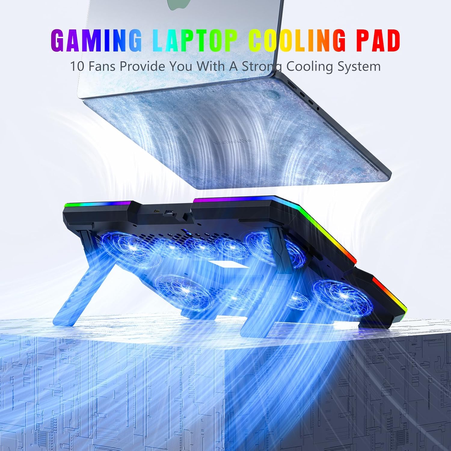 Laptop Cooling Pad, Gaming Laptop Cooler with 10 Quiet Fans, Height Adjustable Laptop Cooling Stand for 12″-17″ Laptops, RGB Lights with Laptop Fan with 2 USB Port and Phone Stand