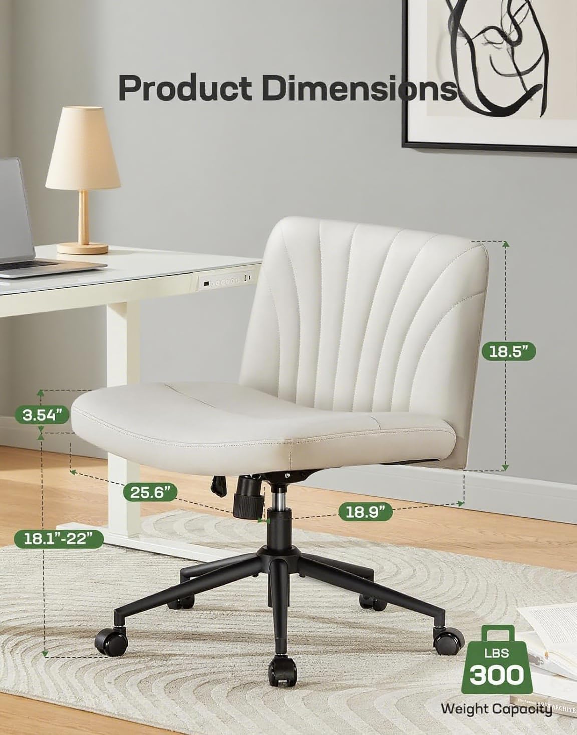 Marsail Criss Cross Chair with Wheels, Wide PU Leather Armless Desk Chair, Swivel & Height Adjustable Cross Legged Office Chair for Makeup, Small Spaces, Bedroom, Vanity