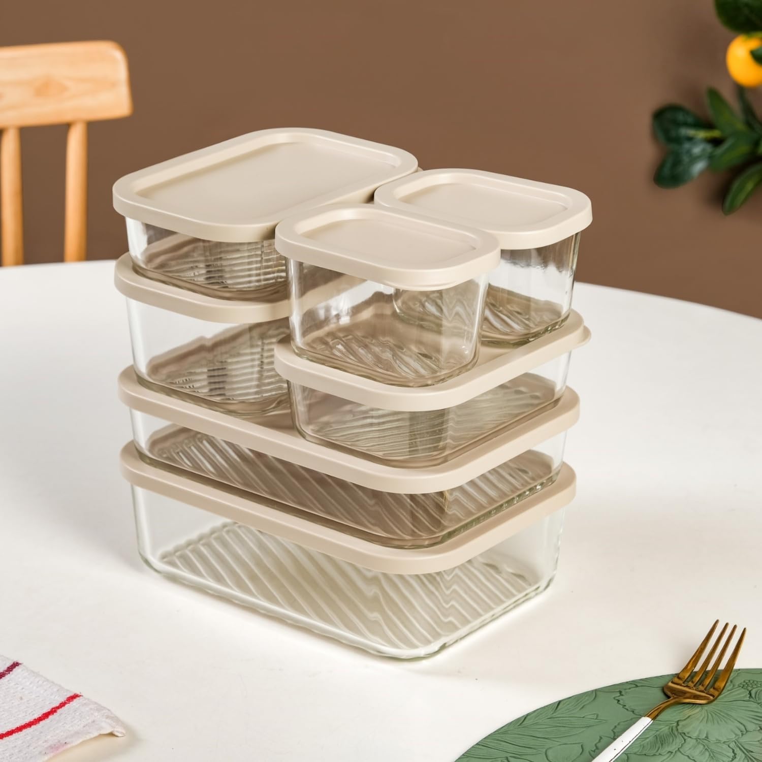 Nestasia Glass Fridge Storage Box Set of 7 (S-310ml x 2, M-520ml x 2, L-750ml, XL-1200ml, XXL-1700ml) Transparent Stackable Glass Container with Lid, Microwave & Dishwasher Safe (Beige)