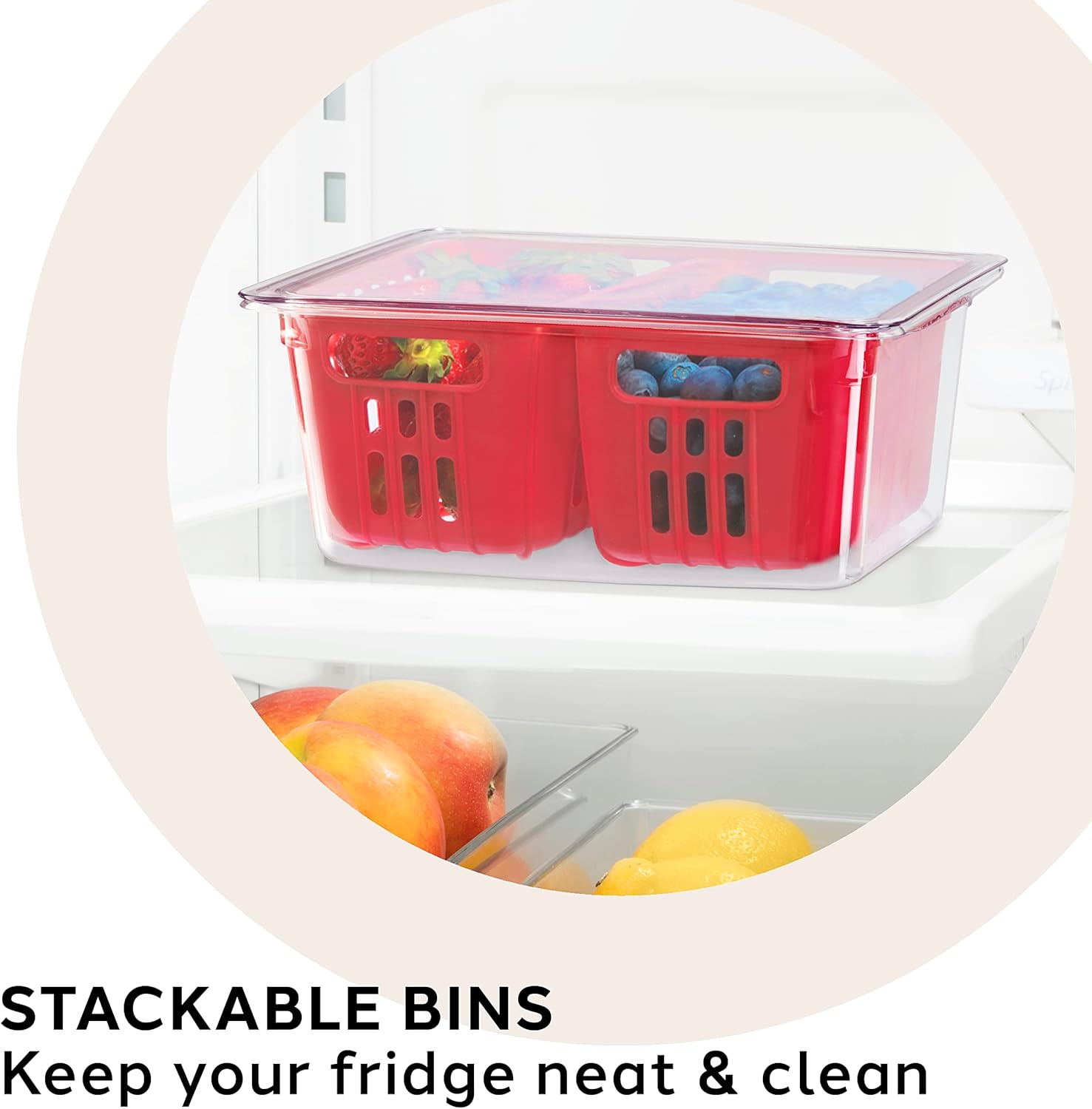 STACKABLE FRIDGE PRODUCE ORGANIZER BINS: These storage containers have flat lids which make them stackable to help maximize your fridge space.