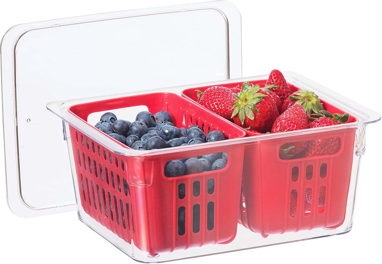 2 REMOVABLE BERRY COLANDER BASKETS: Each berry basket colander insert has ample drainage slots allowing you to clean berries before storage and keeping moisture away from the berries to avoid spoilage.