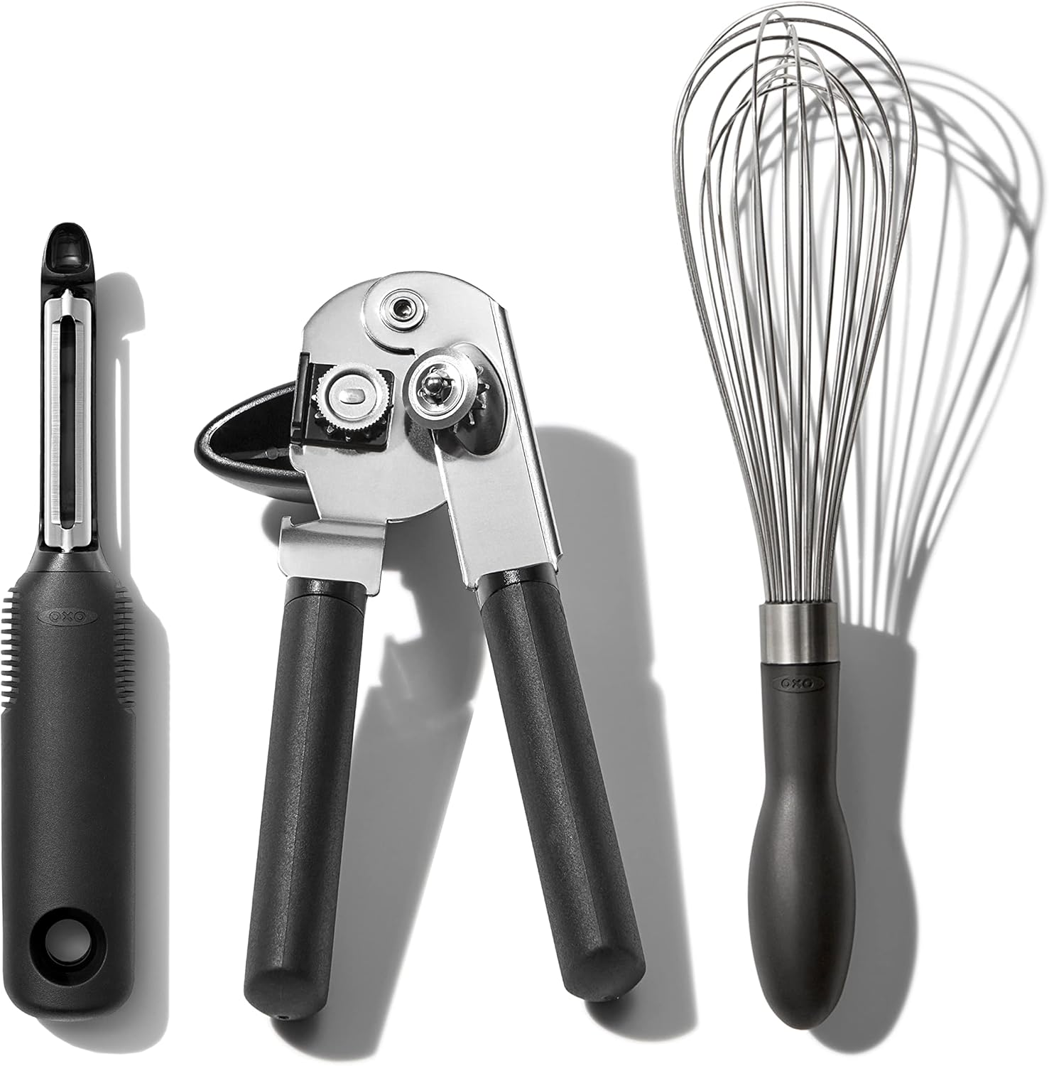 Tackle common kitchen duties with this convenient set featuring our top three best-selling tools. The OXO Good Grips 3-Piece Everyday Kitchen Tool and Utensil Set includes Swivel Peeler, 11-in/28 cm Balloon Whisk, and Soft-Handled Can Opener. These everyday essentials add comfort and convenience to common kitchen tasks. All feature our signature non-slip grip and comfortable handles.