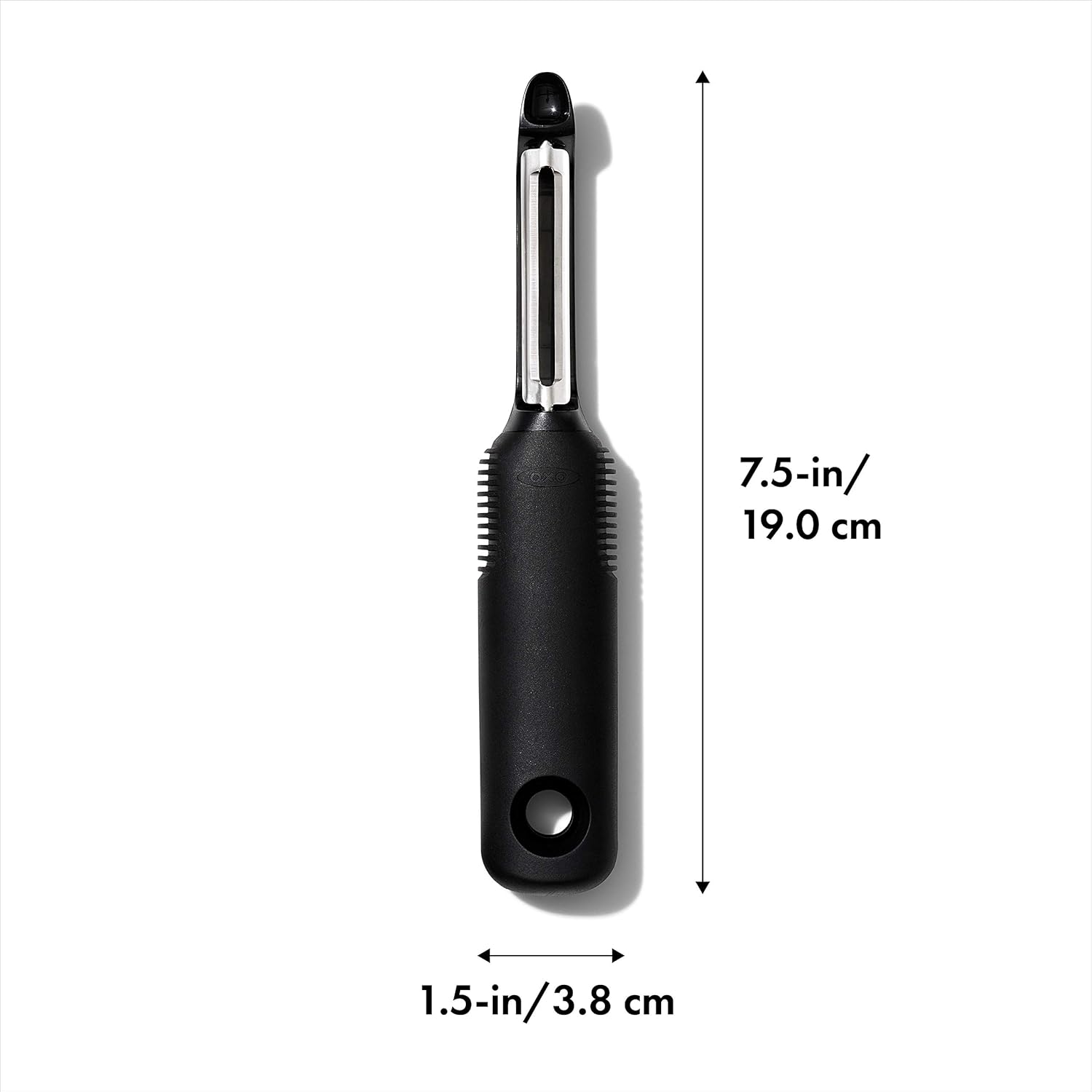 The OXO Good Grips Swivel Peeler is perfect for prepping tough-skinned fruits and vegetables. Twin stainless steel blades flex to remove large swaths of skin with each stroke. The comfortable, oversized handle was designed for fast, repetitive use and won’t slip, even when wet. A durable, built-in eye remover carves out blemishes without ruining your produce. The Peeler is dishwasher safe and includes a large in-handle hole for simple storage. Whether peeling a Granny Smith apple or a fruit with an even tougher skin, the OXO swivel peeler is an essential tool in any kitchen. Its flexible, rotating stainless-steel blades make peeling simple by contouring to almost any surface shape. The built-in potato eye remover is durable and can easily carve out blemishes without digging. The Good Grips line features durable, nonslip, flexible handles on every product. Ergonomically designed to fit the palm comfortably and softly, the pressure-absorbing processed rubber handle puts less tension on the hands while still providing an outstanding grip. Made from the same material as dishwasher gaskets, the handles are slip-proof–wet or dry–as well as dishwasher-safe. Good Grips products have won the Tylenol/Arthritis Foundation Design Award.