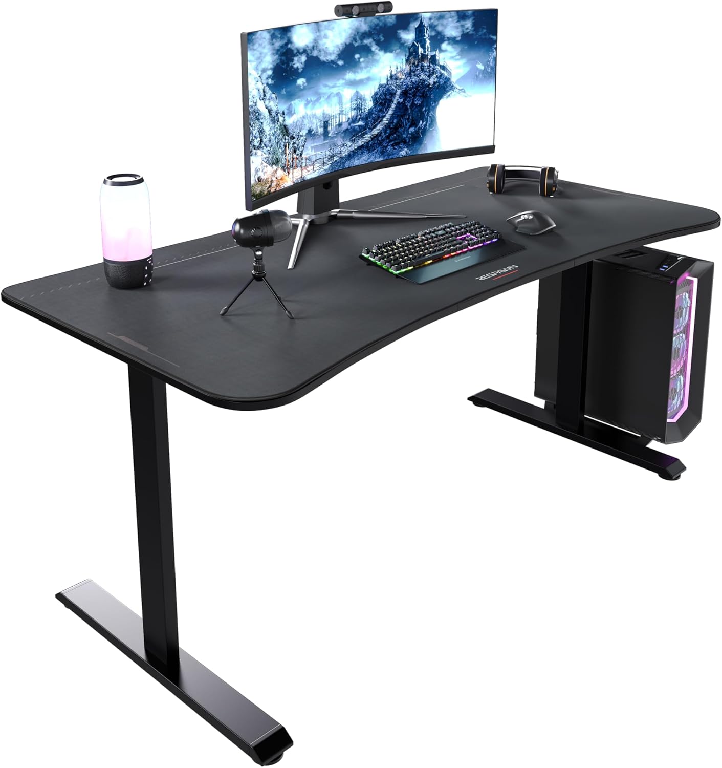 GET CLOSER TO THE ACTION with the gaming desk’s front edge that curves in at the center. The gaming desk provides lots of room for gaming gear, measuring 31.5″ D x 63″ W x 28.54″ H. There’s plenty of space to crank up the DPI on your mouse to dial in your shot.
