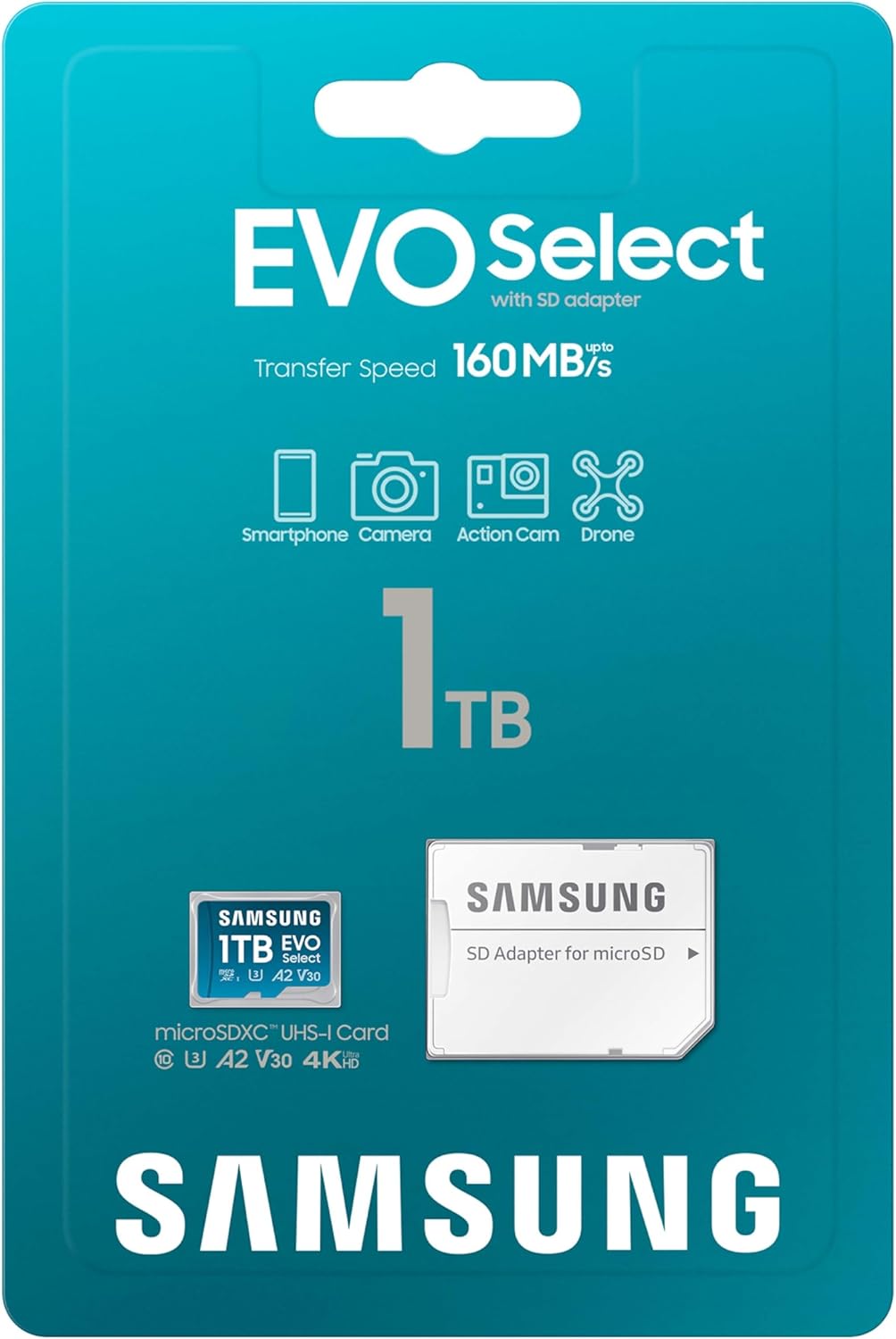Samsung EVO Select microSD Memory Card + Adapter, 1TB microSDXC, Up-to 160 MB/s, 4K UHD, UHS-I, C10, U3, V30, A2, for Mobile Phone, Smartphones, Nintendo-Switch, and Tablets (MB-ME1T0SA/AM)