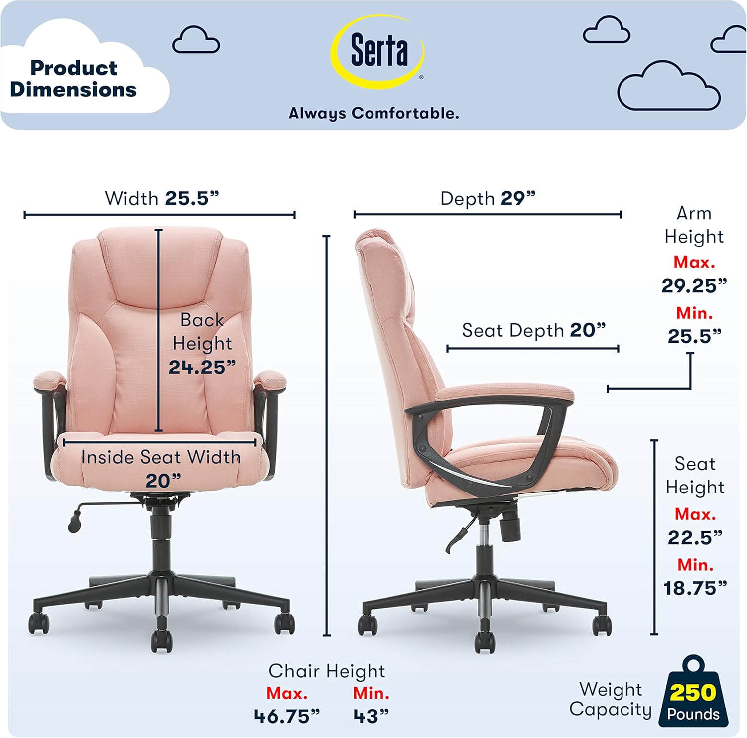 9 reviews for Serta Connor Executive Office Chair, Ergonomic Computer Chair with Layered Body Pillows, Contoured Lumbar, Adjustable Seat, Microfiber Fabric, Pink
