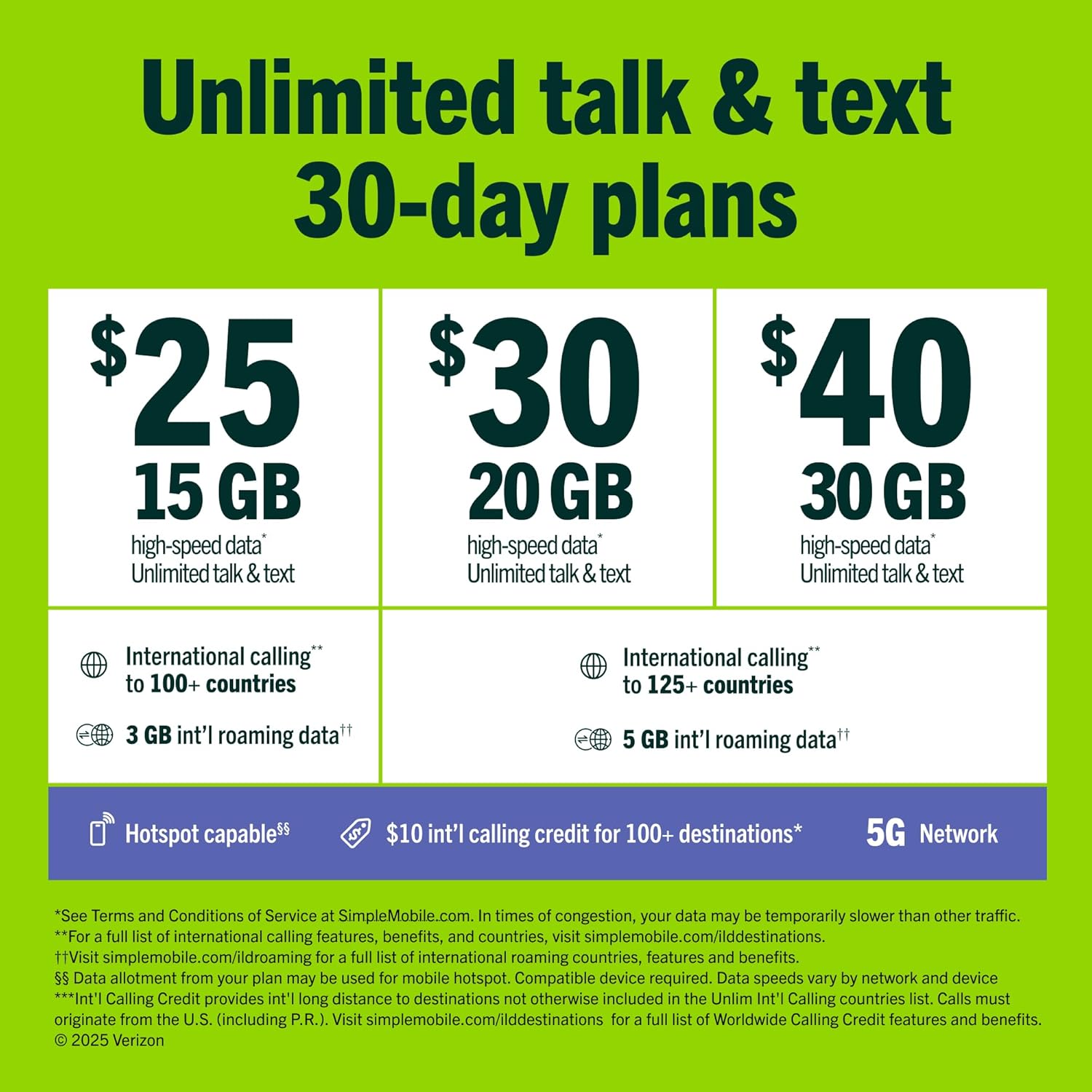 Compatible with Simple Mobile data and unlimited talk & text plans starting at $25/mo plus taxes and fees. To find the Simple Plans available to purchase, please go to our SM – Amazon Brand Page linked below the product title
