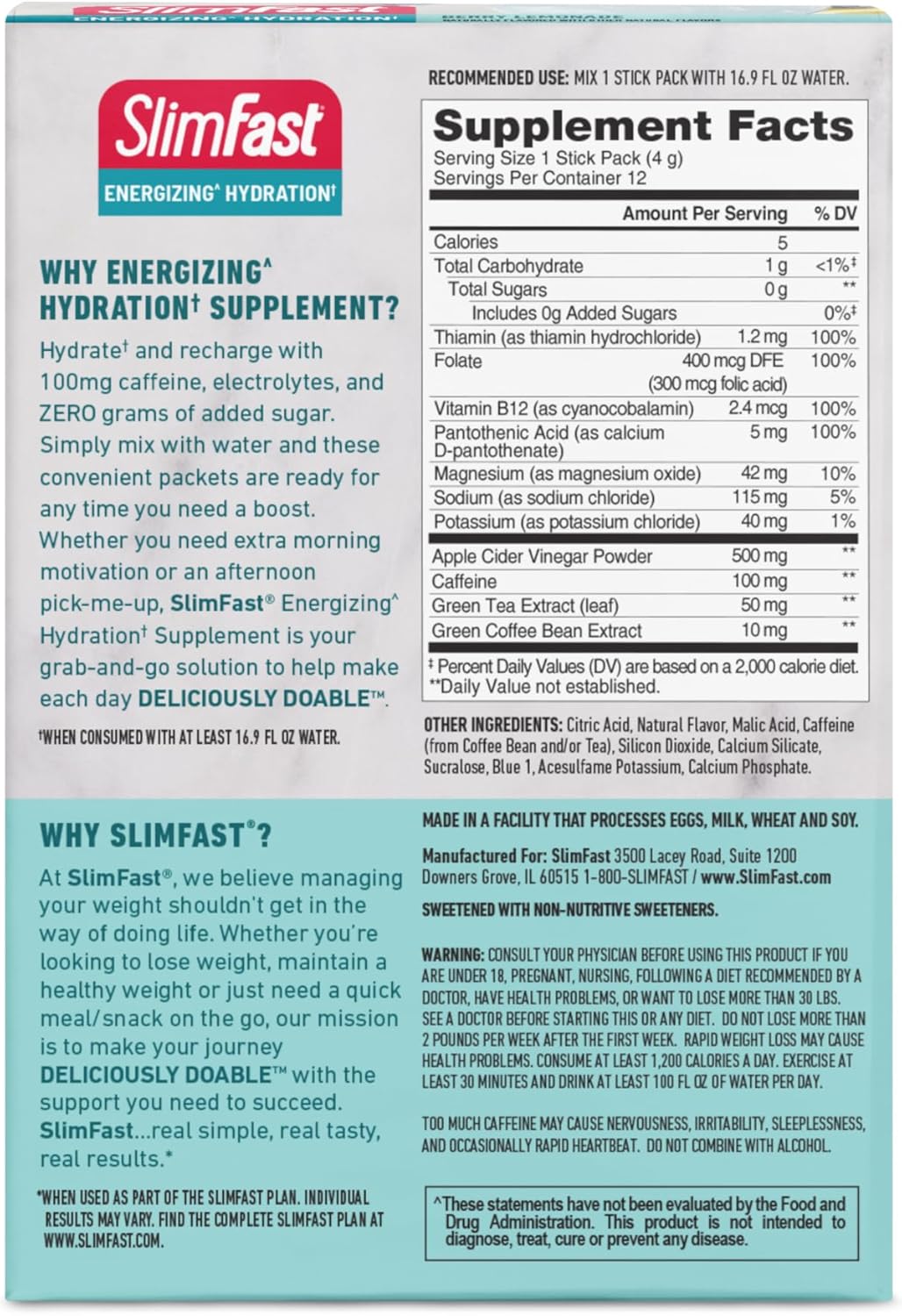 SlimFast Hydration Packets, Intermittent Fasting Electrolytes, Drink Mix Packets, Intermittent Fasting Powder, Energy Powder Drink Mix, Caffeine, Electrolytes for Hydration, Berry Lemonade (12 Count)