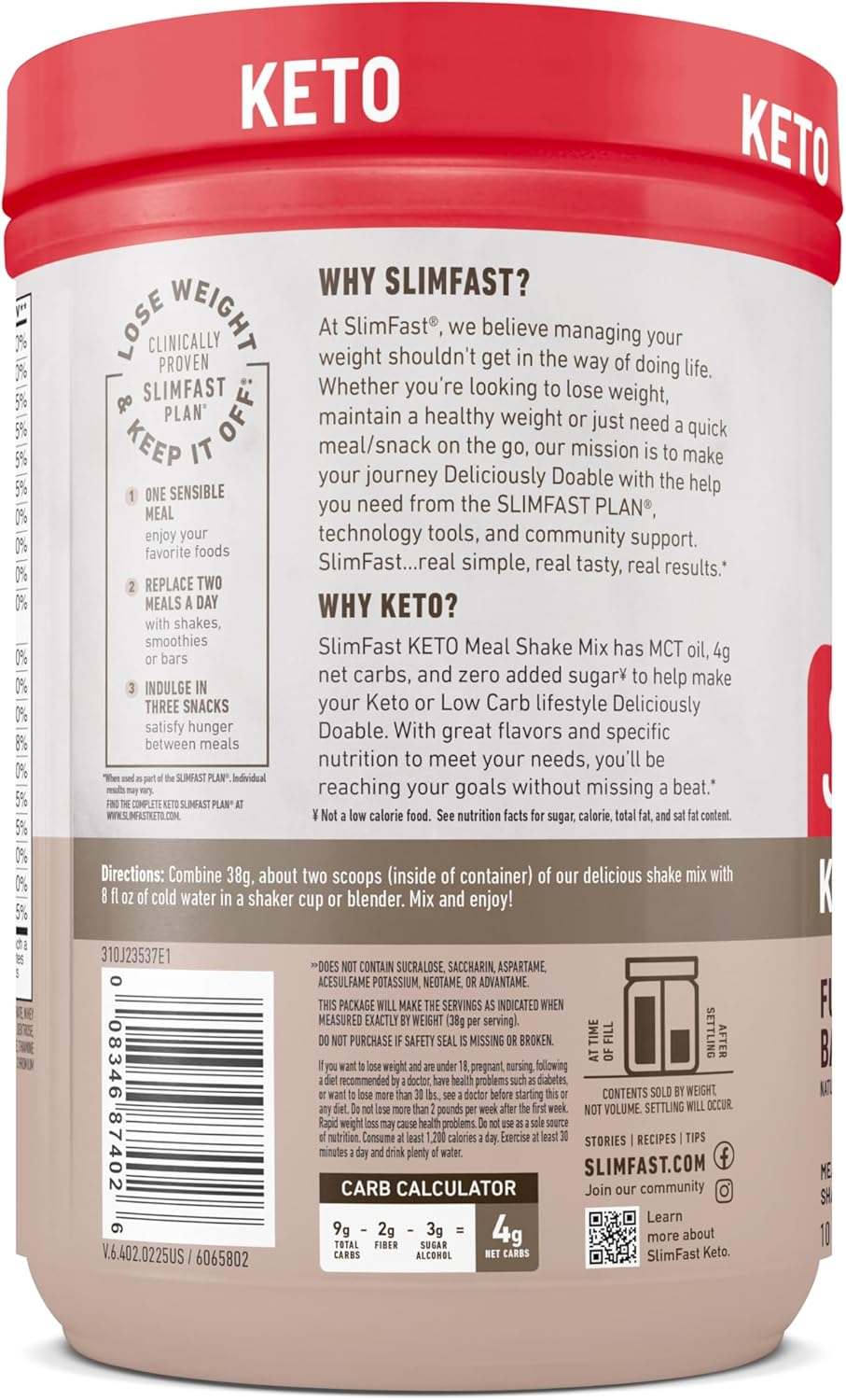 Why save dessert for last? You can have it as a meal with the SlimFast Keto Fudge Brownie Batter Shake Mix. Think rich, creamy chocolate fudge, just like the leftovers from the brownie bowl. The big difference? This shake is Keto-friendly, crafted with ingredients like whey and collagen protein, grass-fed butter and MCTs. Optimally crafted with your goals in mind, this tasty treat is busting with 15g of Keto-friendly fats and only 4 net carbs, is free from gluten, artificial sweeteners, flavors and colors – all with zero added sugar. Simply add 2 scoops to 8 fl oz of water for a decadent, Ketolicious shake. Part of the clinically proven SlimFast Plan, these snacks make Keto as easy as 1-2-3. Enjoy one sensible Keto meal, two SlimFast Keto meal replacements, and three Keto snacks. The SlimFast Plan is clinically proven to help you lose weight fast and keep it off! Not a low-calorie food. **Based on clinical studies of the overall SlimFast 1-2-3 Plan (a calorie-controlled diet, regular exercise and plenty of fluids), demonstrating fast and sustained weight loss. Individual results may vary. Average weight loss is 1-2 lbs per week. Check with your doctor if nursing, pregnant, under 18 or following a doctor prescribed diet.