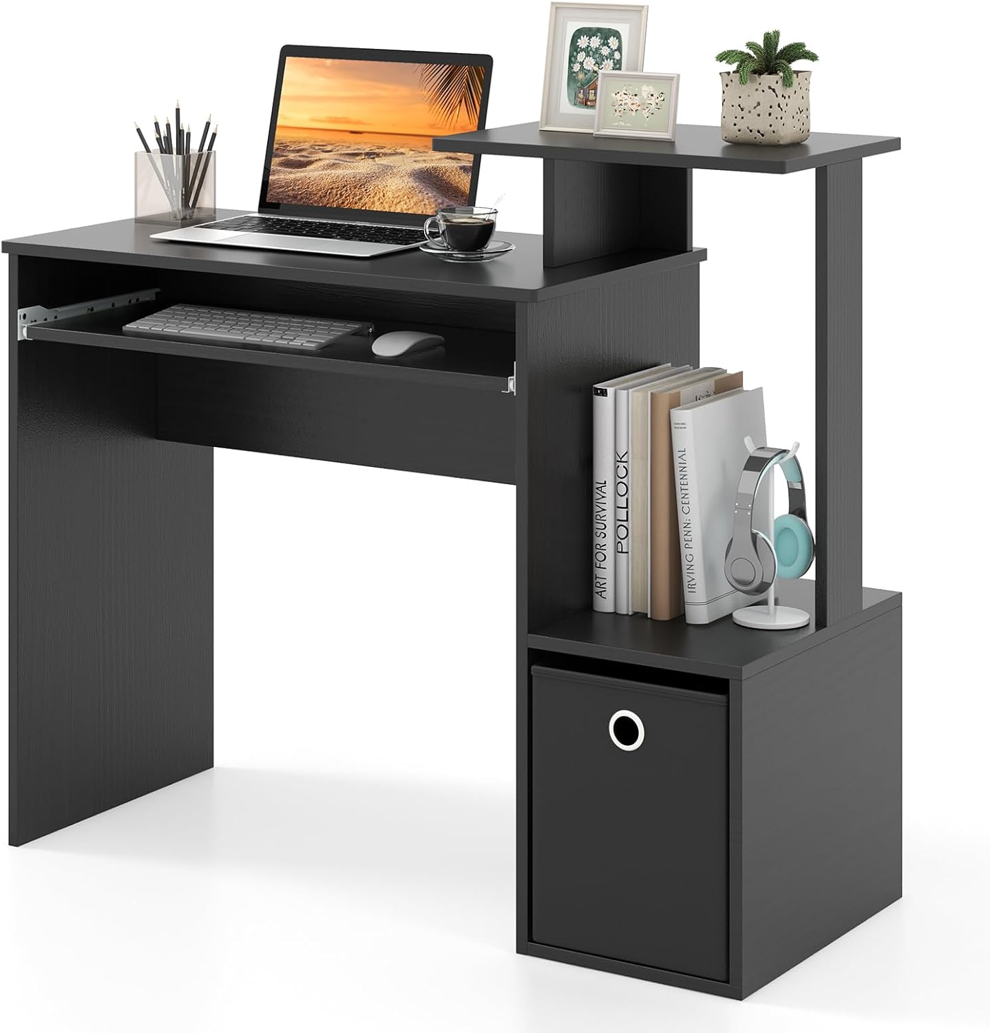 Tangkula Computer Desk with Fabric Drawer & Keyboard Tray, Space-Saving Study Writing Desk with Open Storage Shelves & Printer Stand, Modern Home Office Computer Workstation for Small Spaces (Black)