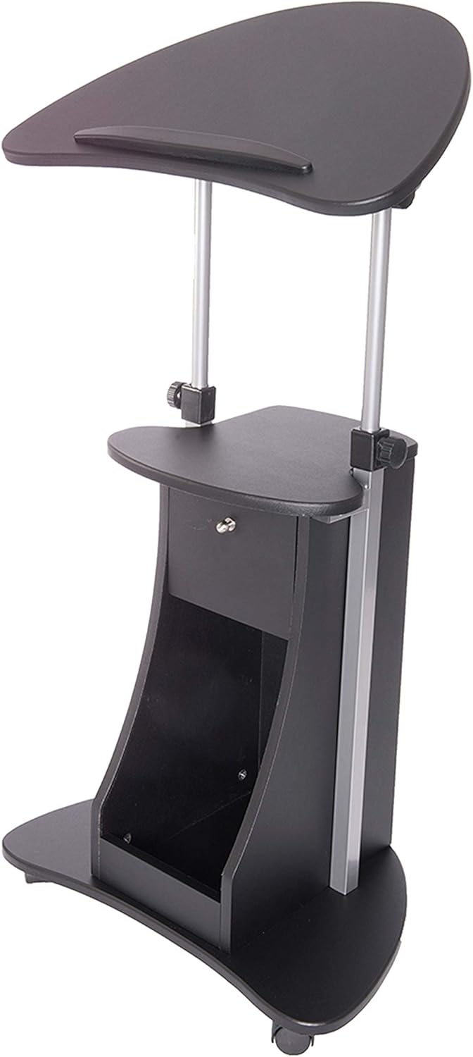 The Techni Mobili Deluxe Rolling Laptop Cart with Storage is made of heavy-duty engineered wood panels with a moisture resistant PVC laminate veneer and a scratch-resistant powder-coated steel frame. The table panel tilts so you can adjust it to the most ergonomic, comfortable working angle. It also features a safety edge-stopper to prevent objects from sliding off when tilted. You can easily adjust the table height between 30.75 and 45.5-Inch with dual adjustment knobs. There is an open storage compartment and a closed storage compartment with bottom hinges. Two of the fours non-marking nylon casters include locking mechanisms. The table and closed storage top and bottom shelves each have a 20 lb weight capacity and the base of the cart has a 30 lb weight capacity. COLOR: Black.