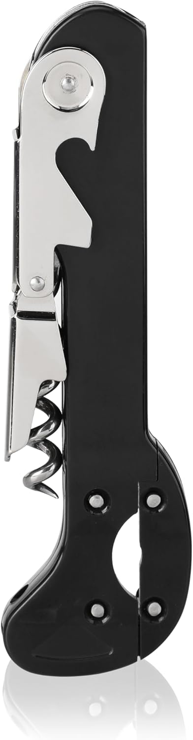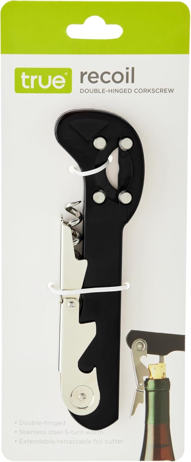 The True Recoil Waiters Corkscrew Wine Opener combines durable stainless steel construction with versatile design, making it a must have tool for bartenders, wine enthusiasts, and everyday hosts. The double hinged mechanism provides steady leverage that makes uncorking wine bottles smooth and efficient. A five turn stainless steel worm glides easily into corks, reducing breakage and ensuring every pour begins seamlessly. For added convenience, the extendable four wheel foil cutter delivers clean and precise capsule removal with minimal effort, while the built in bottle opener gives you flexibility for beers, soda water, sparkling water, soft drinks, and carbonated beverages. Compact yet practical, this corkscrew slips neatly into a drawer, travel bag, or picnic basket, but also looks sleek displayed on a bar cart or kitchen counter. Whether you are hosting dinner for friends, planning date night, enjoying weekend game night, or organizing outdoor gatherings, this wine opener manual transitions easily from home essentials to travel friendly hosting tools. A versatile addition to bar cart accessories, kitchen gadgets, and wine accessories, it also makes a reliable choice for wine gifts, wedding gifts, birthday gifts, anniversary gifts, hostess gifts, and gifts for men.