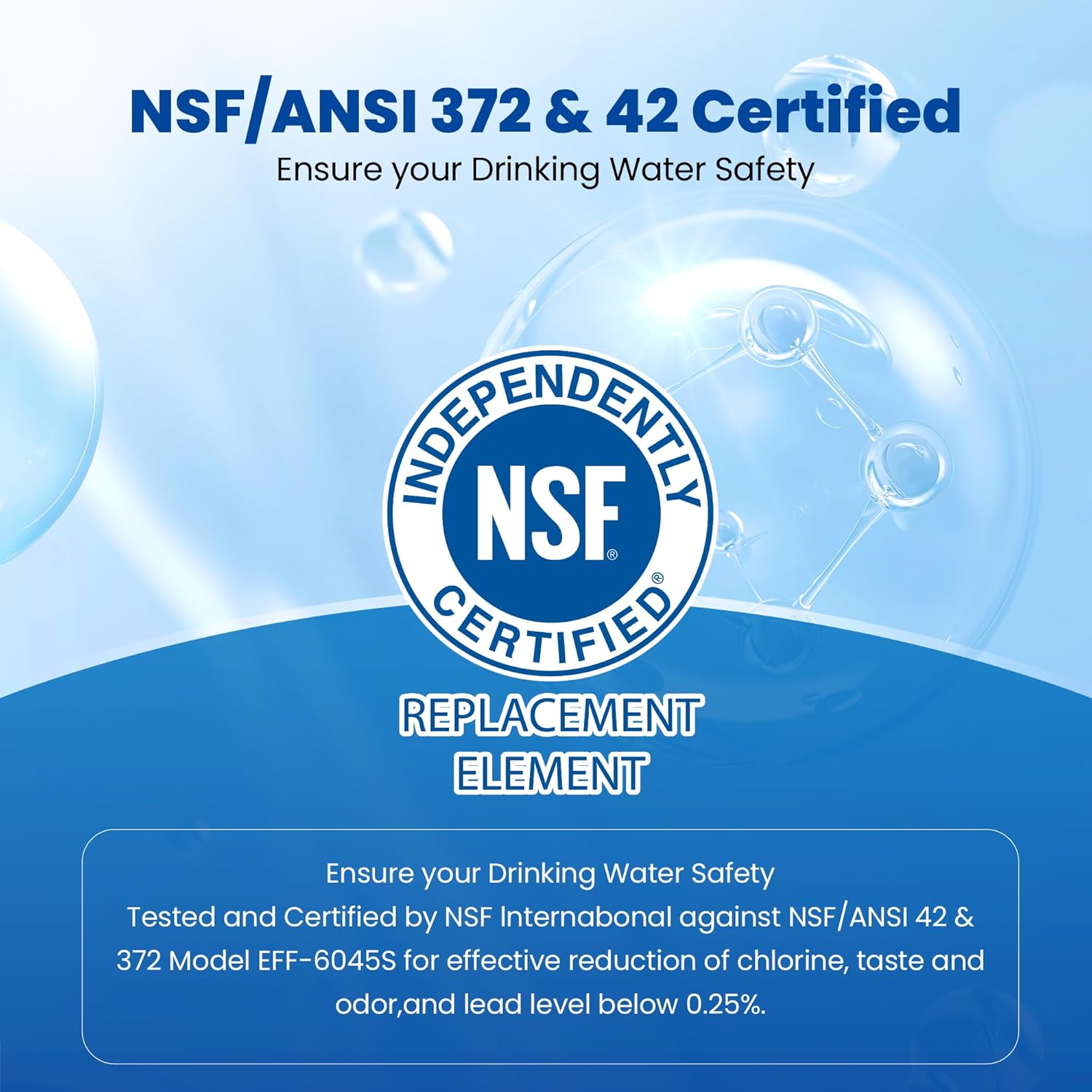 Premium filter material: Waterspecialist selected BPA-free and food-grade filter housing that passed NSF 372 certification for lead-free filtration. We also adopt natural coconut shell carbon block that contains larger surface area and more micropores. Thus, the filter cartridge can efficiently reduce chlorine, bad taste and odor.